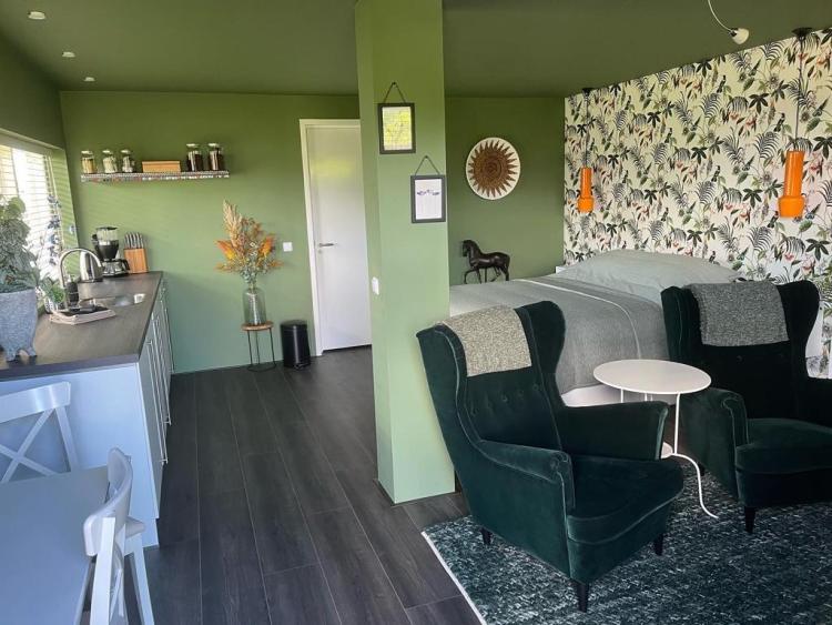 Het verblijf in onze gerenoveerde paardenstal bestaat uit een heerlijk ruime woon-/slaap-/keukenruimte van 30m2. De kamer is voorzien van een zithoek met twee fauteuils, een televisie, WIFI, een bed van 160x200cm en een keukentje met koelkast, koffie/thee corner en de mogelijkheid om zelf een snack of lunch te bereiden.